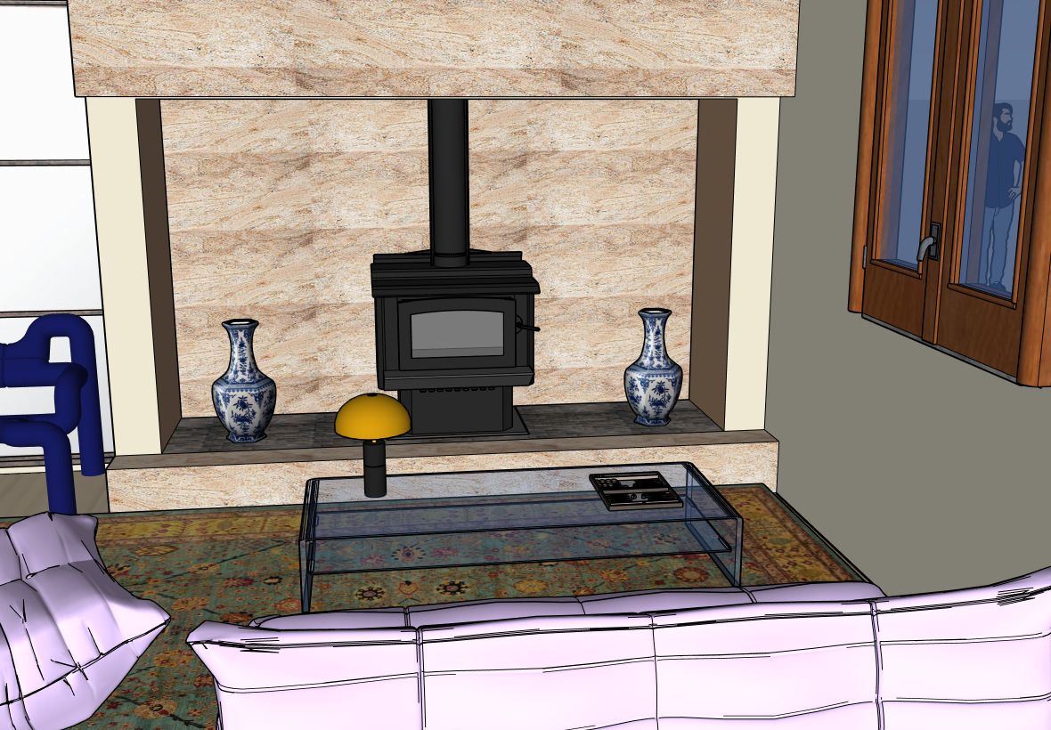 A timeless blend: the original fireplace refreshed and styled with antique vases, paired with a sleek modern side table and contemporary furniture. Natural stone textures meet the softness of carpet and the elegance of modern design. All to a balance of past and present.